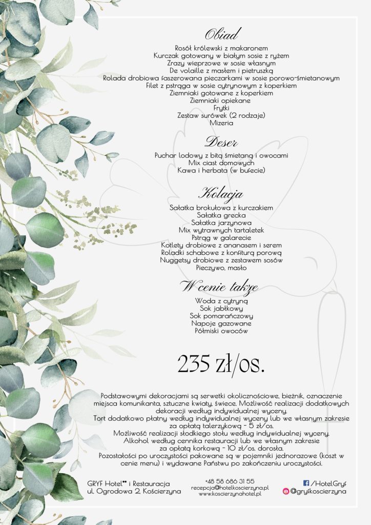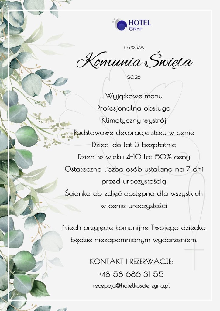 Szukasz sali na przyjęcie, bo zbliża się sezon na komunie? Organizacja takiej uroczystości w restauracji hotelowej niesie ze sobą wiele korzyści. Zapraszamy do skorzystania oferty obejmującej planowanie przyjęcia z okazji Pierwszej Komunii Świętej dziecka w lokalu Hotelu Gryf. Wyjątkowe menu oraz korzystne warunki współpracy sprawiają, że jest to miejsce szczególnie popularne wśród mieszkańców Kościerzyny i gminy Stężyca, w tym wsi Szymbark. Nasza restauracja cieszy się dużym zainteresowaniem w okresie wiosennym, wówczas komunie odbywają się niemal co weekend, dlatego warto zarezerwować termin z wyprzedzeniem. Jeśli interesuje Cię kompleksowa obsługa uroczystości obejmująca dekorację sali oraz serwis, zachęcamy do rezerwacji terminów.